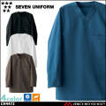 セブンユニフォームの八分袖シャツです。男女兼用です。弊社定番のシャツ生地に抗ウイルスの機能を追加したブラッシュアップ素材を使用しています。強度と安心感を両立しました。袖口にアンダーカバーを配したHACCP対応商品です。スクラブ風のVネックデザインのプルオーバーシャツです。義務化される衛生管理手法「HACCP(Hazard Analysis and Critical Control Point)」は元来は食料品製造業界が主な対象ですが、今や食品関連業界に関わらずあらゆる場面で衛生対策に関するお客様の目が厳しくなり、今後さらに衛生面に配慮したユニフォームが求められるのではないかと考え、対応商品を開発しました。新開発「CASUAL CLEAN(カジュアルクリーン)ユニフォーム」シリーズは、デパートの地下食料品店や街の惣菜店、ベーカリーなどに向けた、軽装備のHACCP対応ユニフォームです。