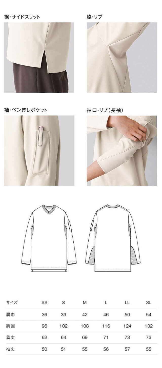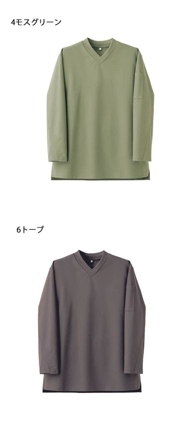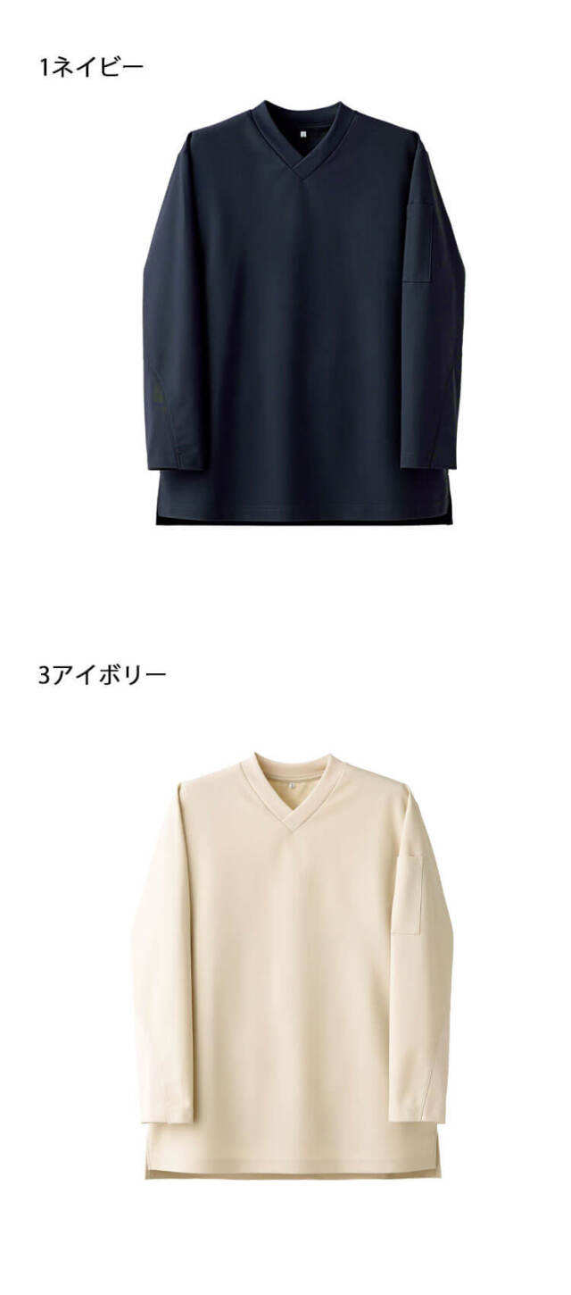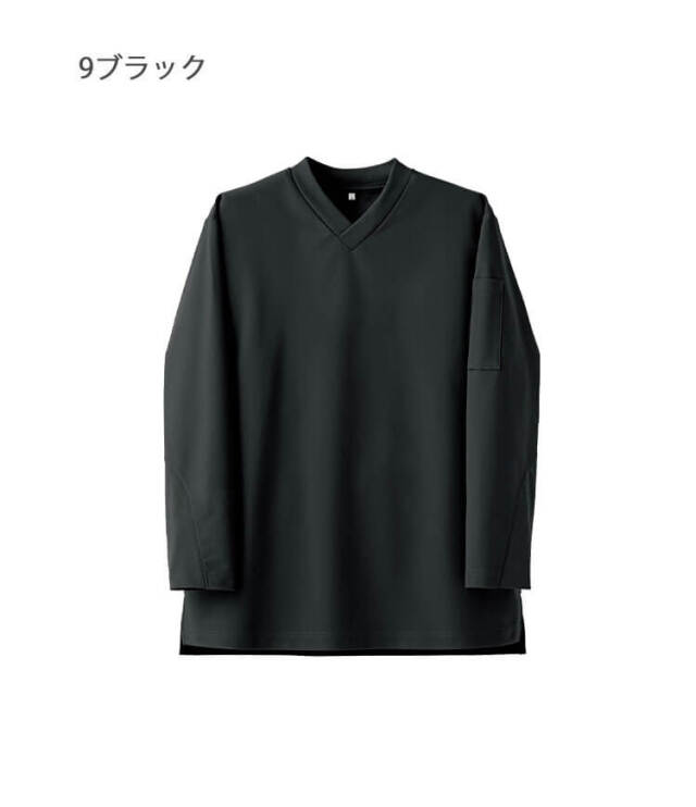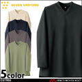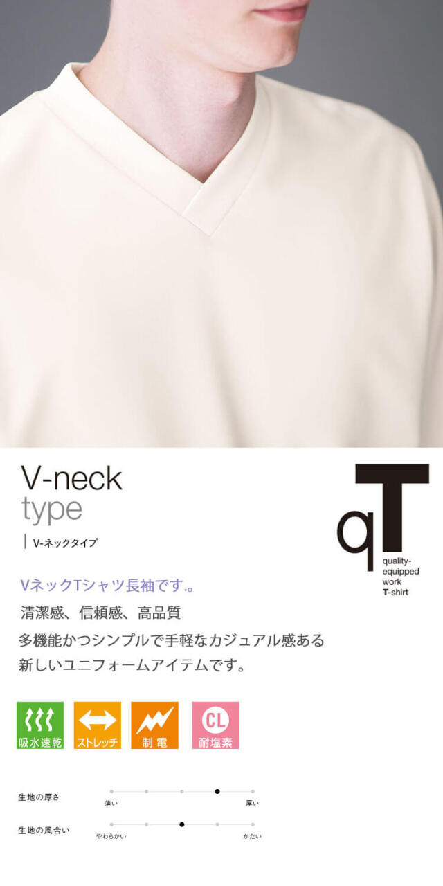 セブンユニフォームのニットシャツです。VネックTシャツ長袖です。品格とユニフォーム機能を併せ持つTシャツ「qTシリーズ」の1つです。清潔感、信頼感、高品質、多機能かつTシャツの特性であるシンプルで手軽なカジュアル感ある新しいユニフォームアイテムです。ホテル、レストラン、アミューズメント等のサービスの方へオススメです。ハイクオリティーTシャツを開発しました。Tシャツアイテムに注目したのはそのカジュアルさと誰もが抵抗なく着れる気軽さです。これを昇華させることでコンセプトに合うサービスユニフォームが出来るのではないかという思いからです。大きな特徴は3つです。カジュアルながらも高品質、かつ必要なユニフォーム機能があることです。働く人が品よく素敵に見えることです。商品がモダンデザインになっていて、かつ内装と調和することです。「qT/quality-equipped work T-shirt」シリーズは、Tシャツが持っているシンプルで手軽なカジュアル感を活かしつつ、ホテル等で必要とされる、質の高いおもてなしに対応できる品格と清潔感を持ち、それ単体でもユニフォームとして成立するシャツをコンセプトとしてデザインしました。 サイズ感や生地にもこだわり、ユニフォームクオリティで最良の着心地と機能性を備えた、新しいTシャツシリーズとなりました。
