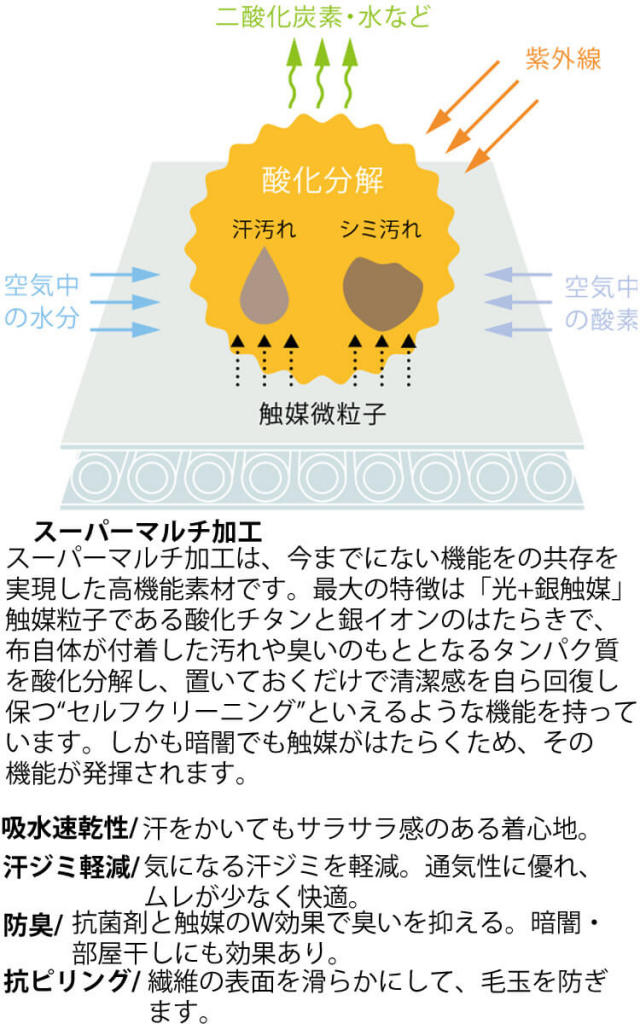 セブンユニフォームのニットシャツです。女性用です。スーパーマルチ加工は、今までにない機能の共存を実現した高機能素材です。最大の特徴は「光+銀触媒」機能。触媒粒子である酸化チタンと銀イオンのはたらきで、布自体が付着した汚れや臭いのもととなるタンパク質を酸化分解し、置いておくだけで清潔感を自ら回復し保つ「セルフクリーニング」といえるような機能を持っています。しかも暗闇でも触媒がはたく為、その機能が発揮されます。鹿の子素材は、平織の変化組織により通気性が高く、ポリエステルフィラメントの糸により滑りが良く光沢感がある、エレガントな素材です。ホテル、レストラン、和食店、料亭、旅館、居酒屋、和カフェ、お土産店、ベーカリー、スイーツ店などどんな職種にも対応できるシャツです。