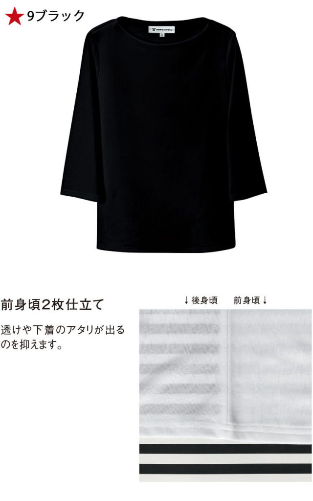 セブンユニフォームのニットシャツです。女性用です。透けや下着のアタリが出るのを抑える前身頃2枚仕立てです。ホテル、レストラン、和食店、料亭、旅館、居酒屋、和カフェ、お土産店、ベーカリー、スイーツ店などどんな職種にも対応できるシャツです。