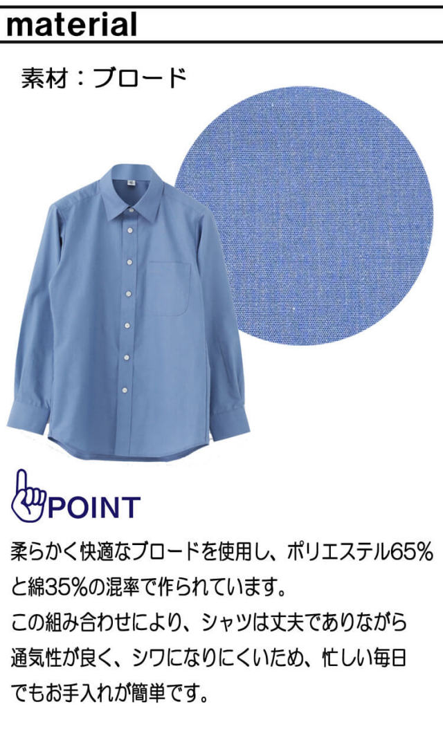 働くすべての人々のためにデザインされた、男女兼用の長袖シャツです。このシャツは、日々の仕事を快適にするために、スタイルと機能性を兼ね備えています。素材には、柔らかく快適なブロードを使用し、ポリエステル65%と綿35%の混率で作られています。この組み合わせにより、シャツは丈夫でありながら通気性が良く、シワになりにくいため、忙しい毎日でもお手入れが簡単です。カラーは、ホワイト、ネイビー、サックス、ブルーグレー、インディゴブルー、ブラン、ベージュ、チャコールグレー、ブラックの9色を揃えています。豊富なカラー展開により、どんな職場の雰囲気にもマッチする色をお選びいただけます。また、3Sから7Lまでのサイズ展開で、あらゆる体型の方にフィットする一枚を提供します。サイズ表を参考にして、あなたにぴったりのサイズを見つけてください。このシャツは、働く人々のユニフォームとして最適です。オフィス、接客業、サービス業など、さまざまな職場で活躍し、プロフェッショナルな印象を与えます。シンプルでありながらエレガントなデザインと優れた機能性を兼ね備えたこのシャツで、毎日の業務をより快適に、そしてスタイリッシュに。働く皆様のための究極のユニフォームを、ぜひお試しください。