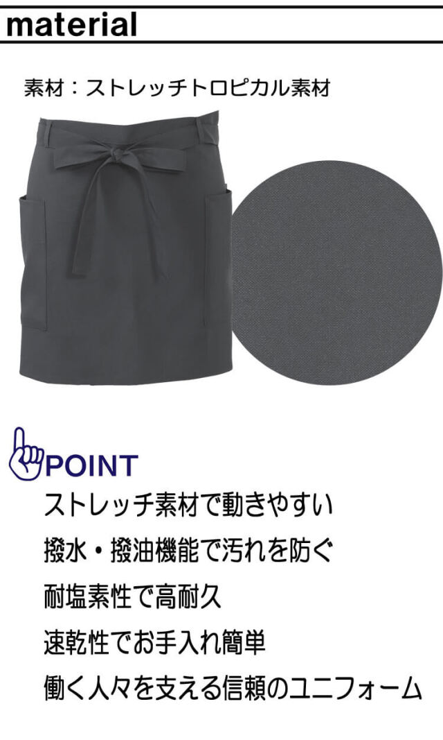 動きやすさと機能性を両立したプロフェッショナル向け腰下エプロンです。しなやかで伸縮性のある生地は、快適な動きをサポートし、長時間の作業でも疲れにくいデザイン。撥水・撥油機能により、水や油汚れも簡単に弾き、飲食店やサービス業、医療現場でも安心して使える優れた機能性を備えています。耐塩素性もあるため、厳しい作業環境でもしっかりと耐久性を発揮し、速乾性が高いので、毎日の洗濯後もすぐに乾き、すぐに使用可能です。腰下エプロンは、あらゆる業界のプロフェッショナルに向けた一枚。快適さと高い機能性を兼ね備え、働く人々の日々をサポートします。スタイルに合わせて選べる丈とカラーバリエーションで、現場の効率と魅力を引き出します。