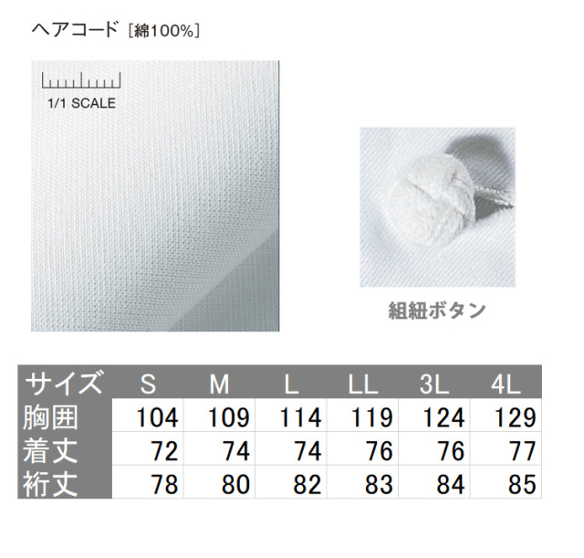 飲食サービス系ユニフォーム セブンユニフォーム C-train シートレイン コットンユニフォーム 長袖コート QA7345 男女兼用 ユニセックス 白衣 SEVEN UNIFORM 白洋社