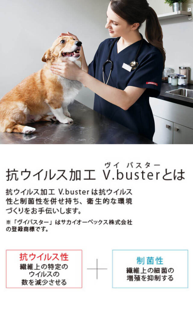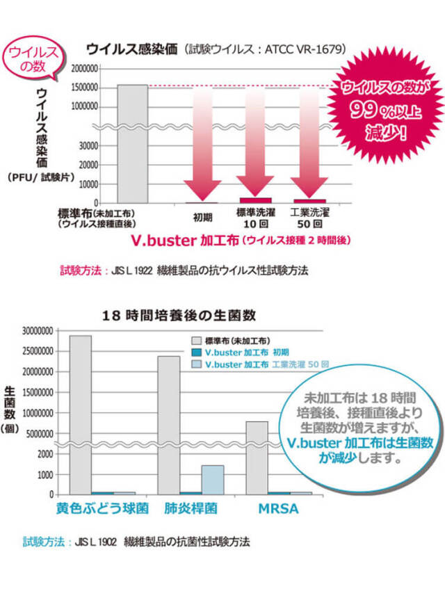 抗ウィルス加工V.busterは抗ウィルス性と制菌性を併せ持ち、衛生的な環境づくりをお手伝いします。