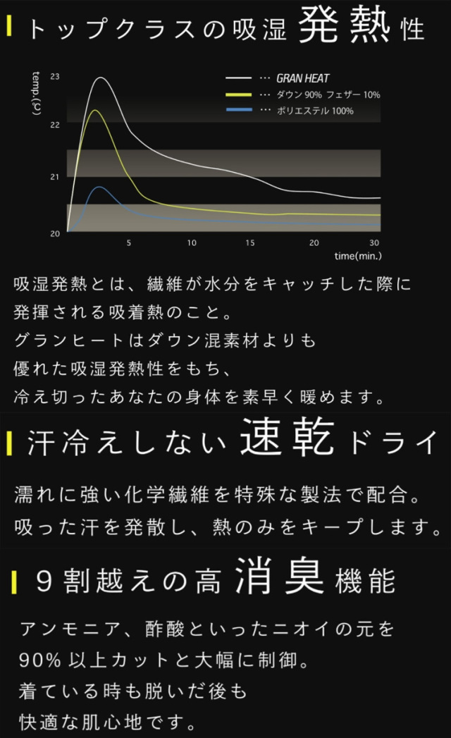 体から発生する汗を利用し、驚きの速さと持続性であたたまる超ハイスペック素材グランヒートがHUMMERに登場。ハニカム状のパンチングがグラフィックに映えるひと味違う発熱コンプレッション。