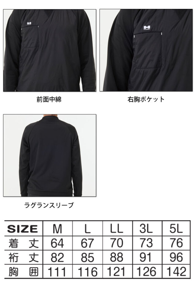 冷気の侵入を防ぐ前面防風中綿仕様で適度な保温性を確保しています。上着とのレイヤードに最適な軽量防寒アイテムです。
