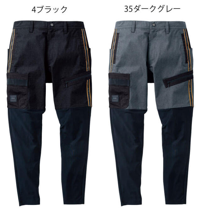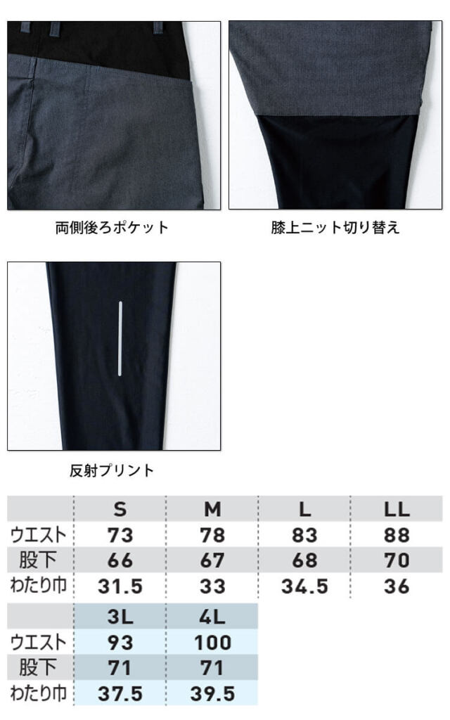 綿高混率素材とニット素材の軽やかに動けるレギンスジョガーパンツです。膝上部分からの切り替えで、動きやすさを追求しました。ハードに使えて軽やかに動ける作業服です。アウトドア風のポケットとループで収納力アップ、大きくて使いやすいバックポケット付きです。