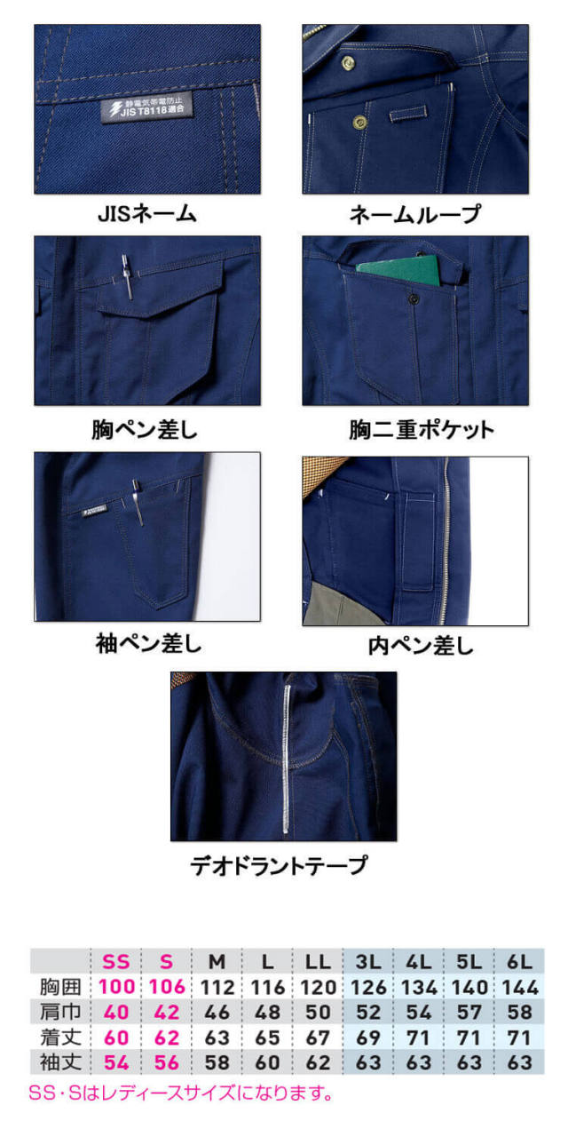 信頼の日本製素材ザ・パワーツイルを使用。窮屈感を感じさせない適度なストレッチ性。ボタン・ファスナーが表に出ないスクラッチガード仕様。JIS T8118規格適合の制電性商品。不快なニオイを軽減するデオドラントテープ付き。消臭加工により不快なニオイを抑える。レディースサイズ対応商品。付属が表に出ないスクラッチガード仕様のT/Cストレッチシリーズ。JIS T8118制電、レディースサイズ、多色展開と幅広いニーズに対応可能。