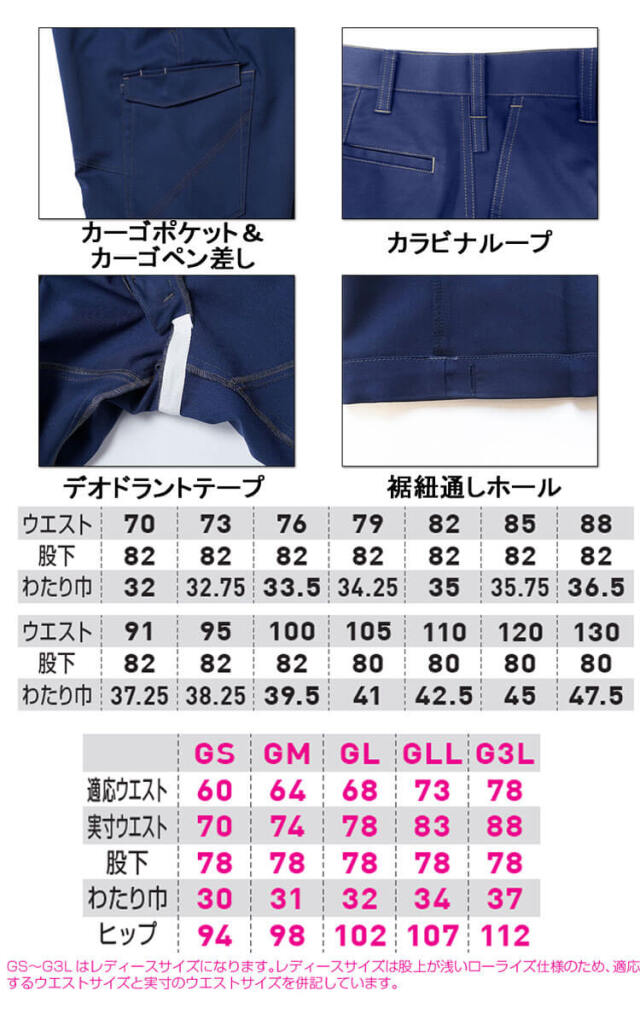 ※GS~G3Lはレディースサイズになります。レディースサイズは股上が浅いローライズ仕様のため、適応するウエストサイズと実寸のウエストサイズを併記しています。