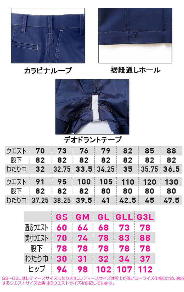 ※GS~G3Lはレディースサイズになります。レディースサイズは股上が浅いローライズ仕様のため、適応するウエストサイズと実寸のウエストサイズを併記しています。