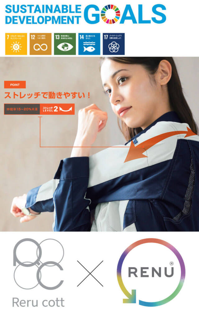 環境配慮生地を使用したSOWA長袖シャツです。「再生ポリエステル RENU」と「エコ素材リルコット(綿)」を混紡した作業服です。古着や残反をリサイクル原料としたポリエステル「RENUを使用」、未利用繊維を再利用・再生させたクラボウ「リルコット」を使用しました。ストレッチで動きやすく、JIS T8118規格適合の制電性商品です。生地の裏側の肌離れが良くベタつきにくく、動きやすさを追求した高いストレッチ性のある作業服です。