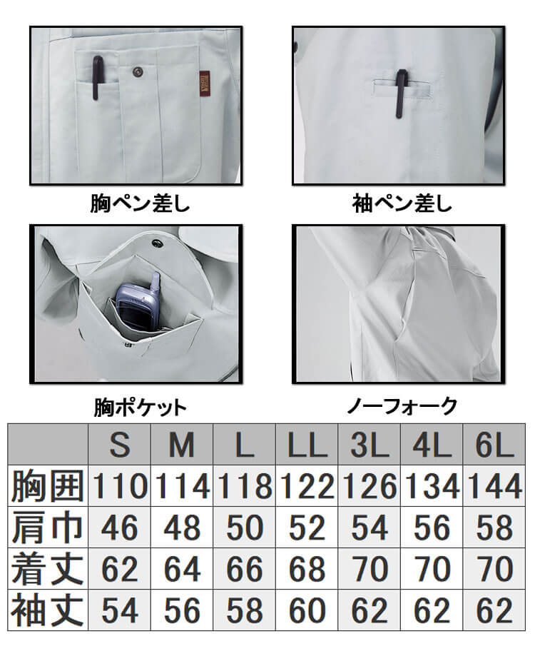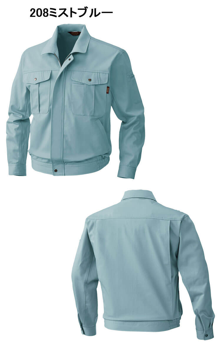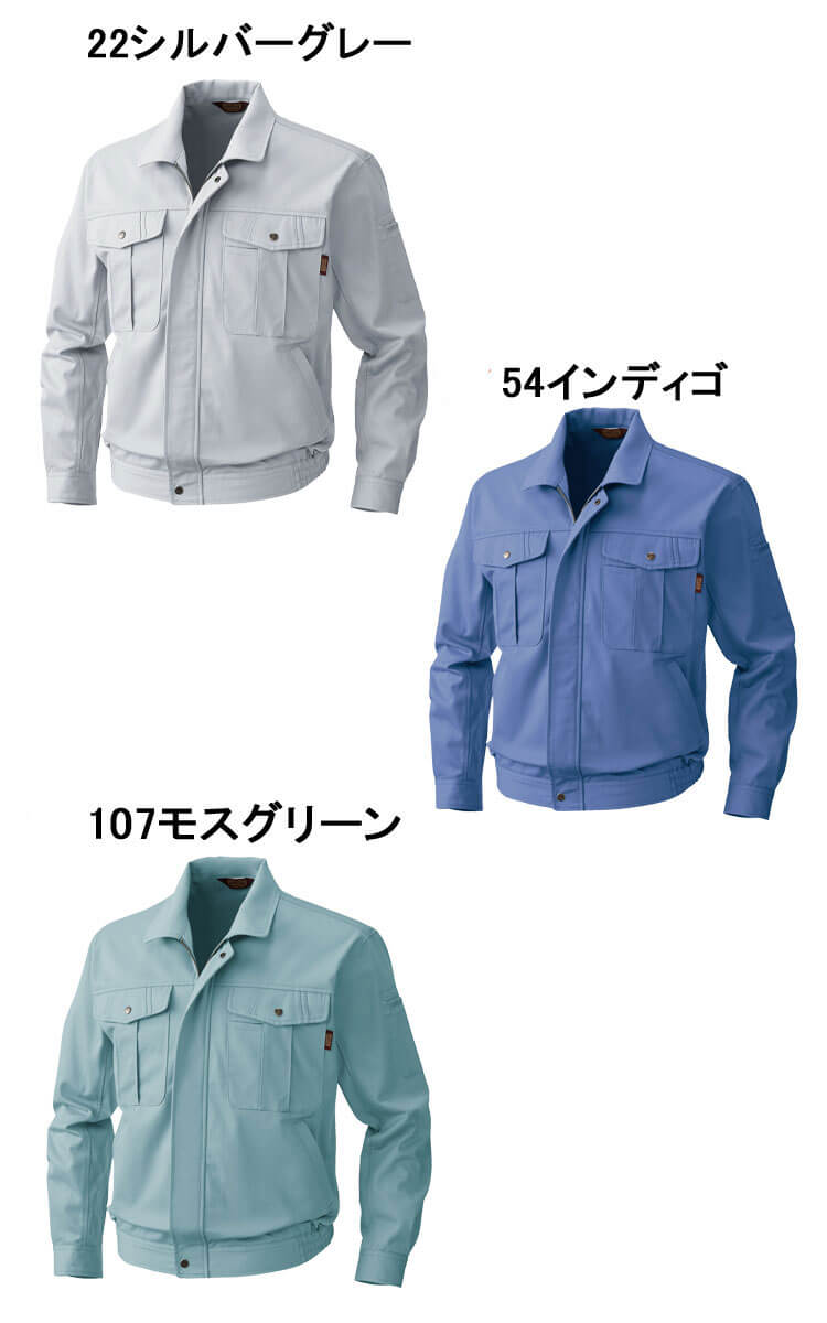 肌触りが良く吸湿性のある綿100%ツイル素材。火を扱う現場にも対応した仕様。防縮・防シワ性に優れた綿100%素材を使用した定番作業服。