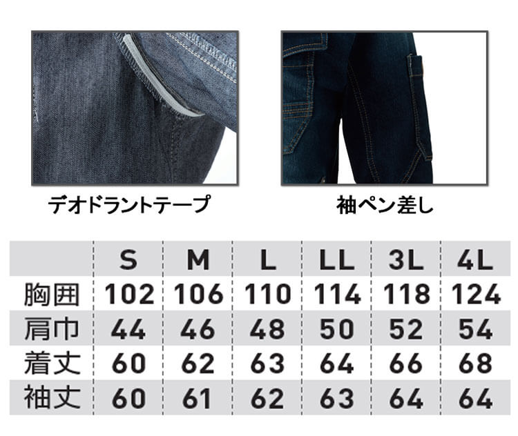 10ozのストレッチデニムを使用。不快なニオイを軽減するデオドラントテープ付き。動きやすさを追求した高いストレッチ性。カジュアルワークの新定番!年間通して着用できるストレッチデニム作業服。