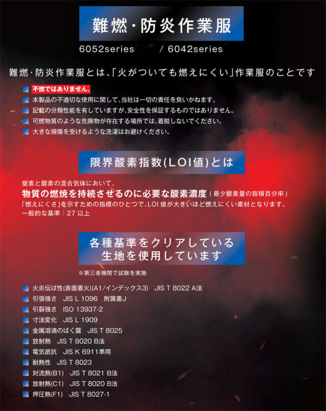 綿100%の防炎加工生地を使用しています。現場で必要とされる機能とデザインを追求した作業服です。ボタン・ファスナーが表に出ないスクラッチガード仕様で、火を扱う現場に対応した仕様になっています。