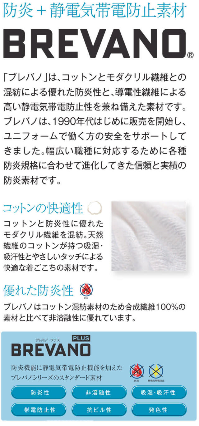 防炎+静電気帯電防止+ストレッチ素材のブレバノプラスを使用しています。現場で必要とされる機能とデザインを追求しました。吸湿・吸汗性に優れたた綿と、防炎性に優れたモダクリル繊維を混紡しています。火を扱う現場に対応した作業服です。