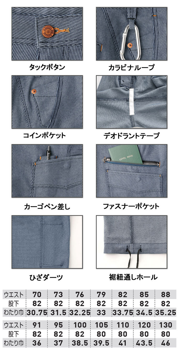 信頼の日本製カルゼを使用。窮屈感を感じさせない適度なストレッチ性。二浴染めによる独特な素材感。不快なニオイを軽減するデオドラントテープ付き。特徴ある素材とスタイリッシュなデザインが人気のカジュアルワーキングウェア。