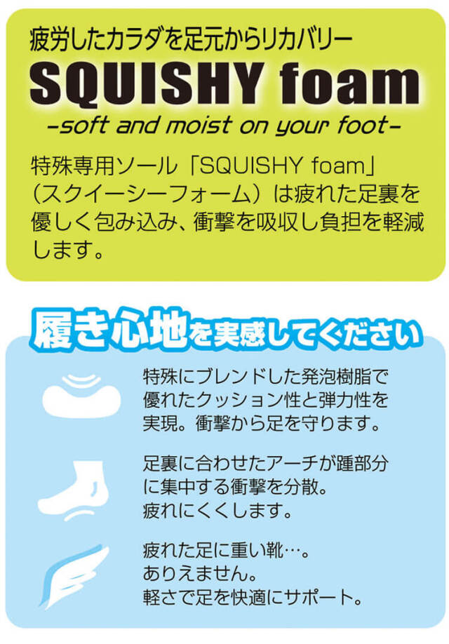 ・特殊専用ソール「SQUISHY foam(スクイーシーフォーム)」は疲れた足裏を優しく包み込み、衝撃を吸収し負担を軽減します。