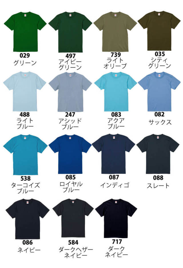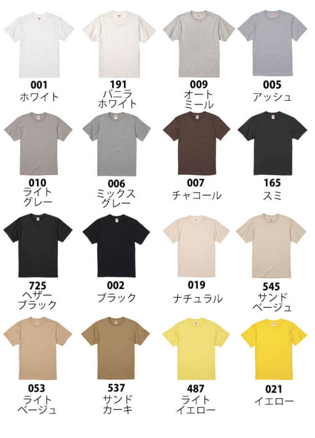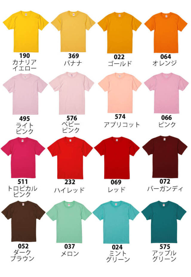 ホワイト・バニラホワイト・オートミール・アッシュ・ライトグレー・ミックスグレー・チャコール・スミ・ヘザーブラック・ブラック・ナチュラル・サンドベージュ・ライトベージュ・サンドカーキ・ライトイエロー・イエロー・カナリアイエロー・バナナ・ゴールド・オレンジ・ライトピンク・ベビーピンク・アプリコット・ピンク・トロピカルピンク・ハイレッド・レッドバーガンディ・ダークブラウン・メロン・ミントグリーン・アップルグリーン・グリーン・アイビーグリーン・ライトオリーブ・シティグリーン・ライトブルー・アシッドブルー・アクアブルー・サックス・ターコイズブルー・ロイヤルブルー・インディゴ・スレート・ネイビー・ダークヘザーネイビー・ダークネイビー・ライトパープル・ラベンダー・バイオレットパープル・パープル