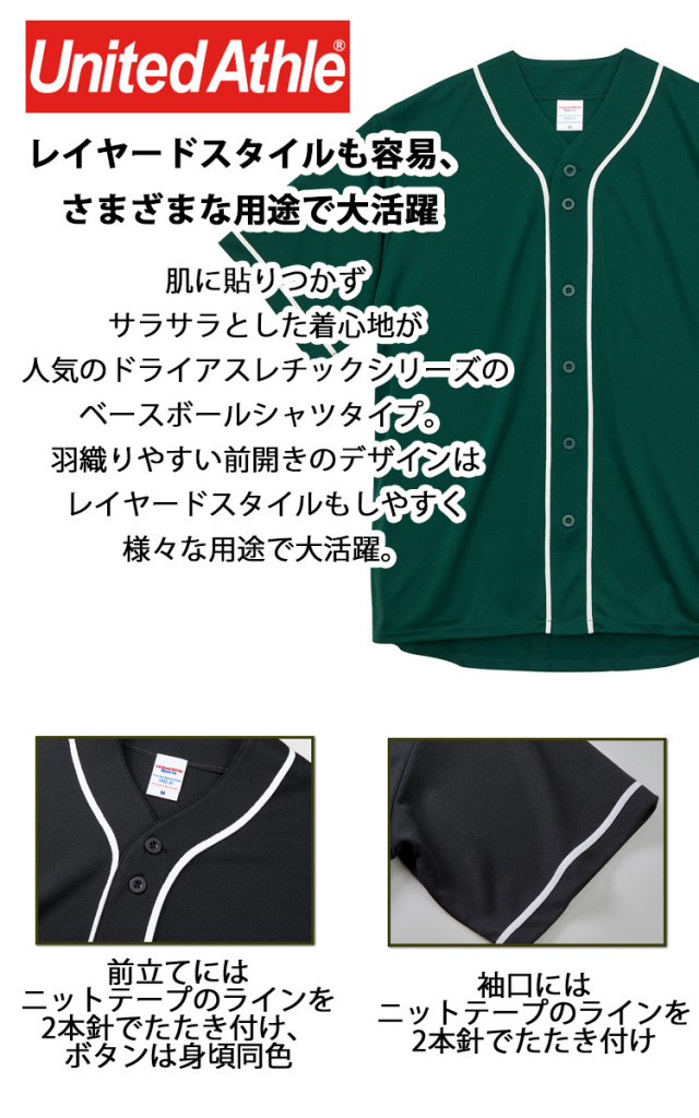 レイヤードスタイルも容易、さまざまな用途で大活躍 発色もきれいな5サイズ展開はチームウェアに最適 肌に貼りつかずサラサラとした着心地が人気のドライアスレチックシリーズのベースボールシャツタイプ。羽織りやすい前開きのデザインはレイヤードスタイルもしやすく様々な用途で大活躍。Tシャツとは一味違う新鮮な印象とドライシリーズ特有のキレイな発色も特長です。充実のサイズとカラー展開でチームウェアやイベントアイテムにも最適な1枚です。