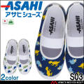 男の子が大好きな恐竜柄のスクールシューズです。国内工場で生産されているので安心して履いていただけます。左右で違い柄がプリントされています。丸洗いができるため清潔に保つことが出来ます。足の甲部分のゴムバンドが足をしっかりと固定してくれます。甲部分が覆われていないため通気性が良い。