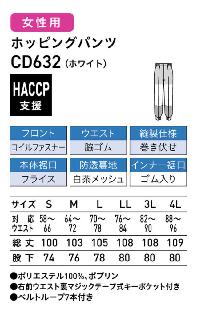 SERVOサーヴォの衛生白衣の女性用の脇ゴムタイプのホッピングパンツです。高温作業場向けのユニフォームです。クールフリーデ(Coolfriede)素材は、汗をかいても持続する、ドライで爽やかな着心地です。素早く汗を吸い上げ、拡散・乾燥するから、涼しさが継続し、着る人のストレスも軽減できます。高い機能性で多くの食品工場のニーズに対応可能です。