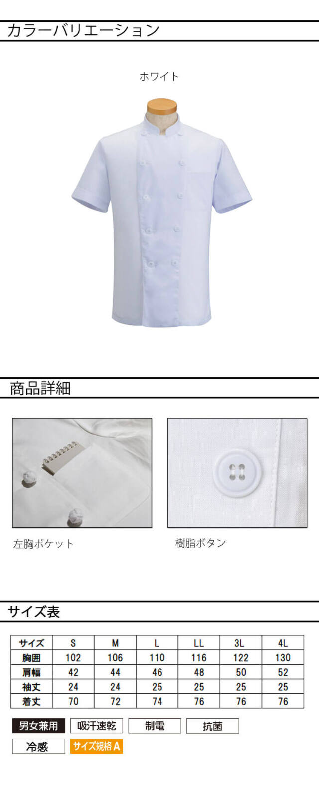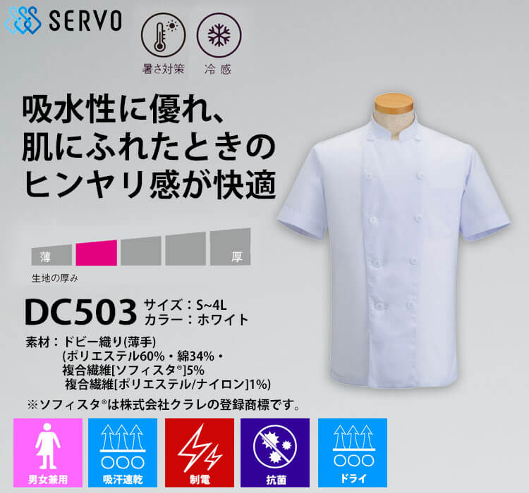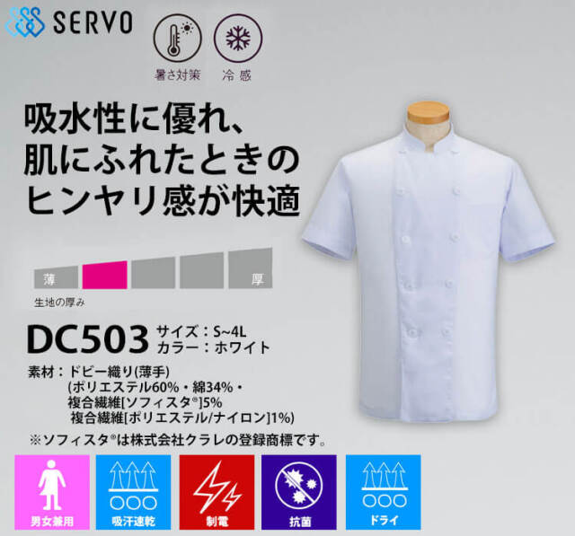 サーヴォの半袖コックコートです。肌に触れるとヒンヤリする冷感素材のため、暑さ対策が出来ます。吸水性に優れており、汗を吸って早く乾かします。制電や抗菌機能もあります。ドライタッチでさらっとした着心地です。左胸にはポケットがついており、ボタンは樹脂になっています。男女兼用で着用者を問いません。
