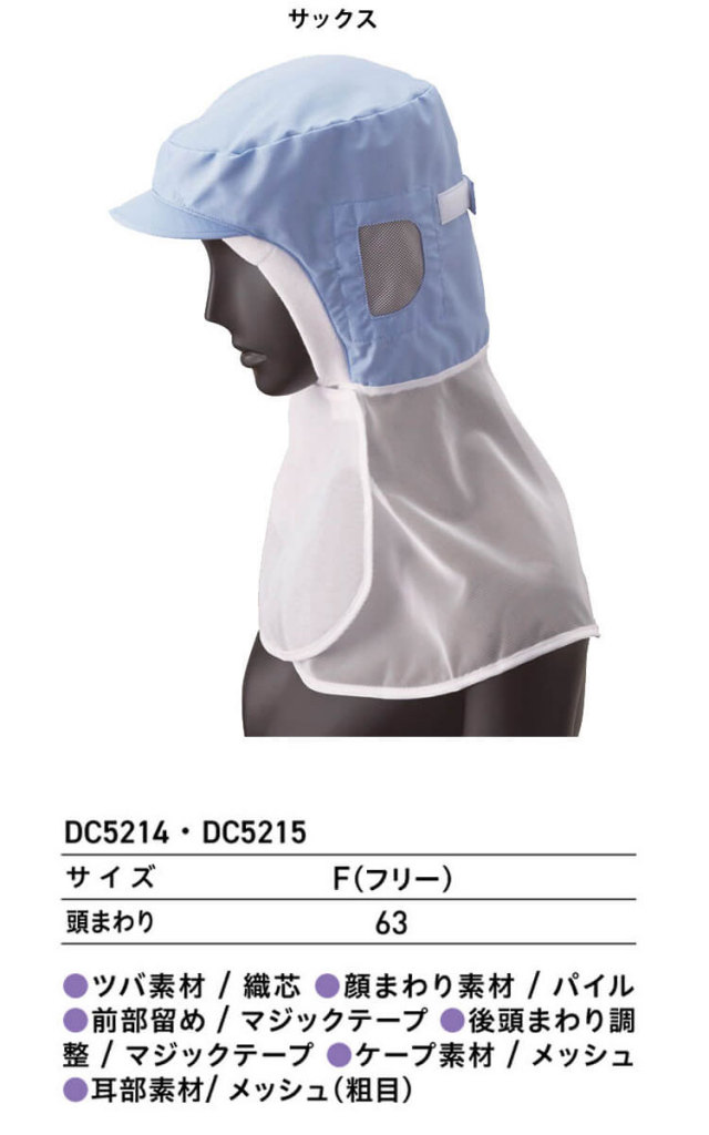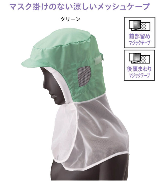 SERVOサーヴォの衛生白衣帽子です。マスク掛けのない涼しいメッシュケープタイプです。異物混入対策が必要な食品工場全般に最適なフードタイプです。異物混入対策に特化した、食品工場全般に適したタイプです。首から胸にかけてケープが付いているので、体毛落下防止をより強化した形状が特長です。アクアクール素材は、肌に触れるだけで感じられるヒンヤリ感が特徴です。生地裏は、凹凸のある“点タッチドライ設計”と高い熱伝導率素材で、ヒンヤリとした冷感を実現します。優れた吸汗・速乾性も持ち合わせた高機能素材です。