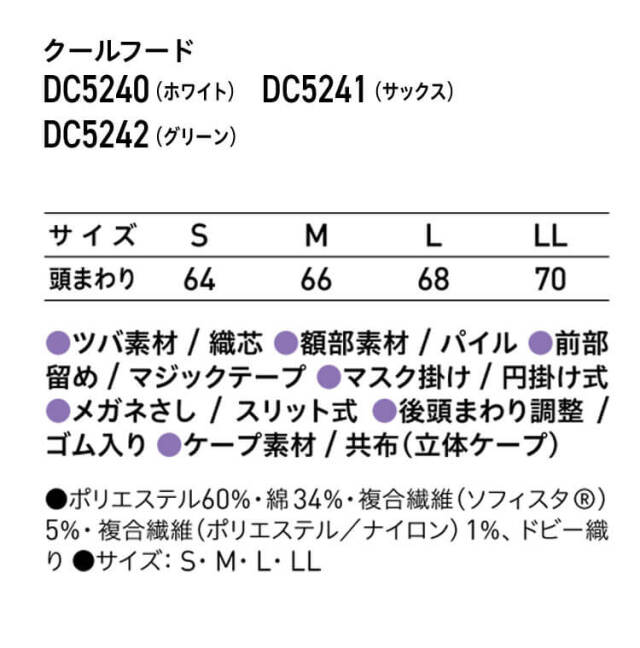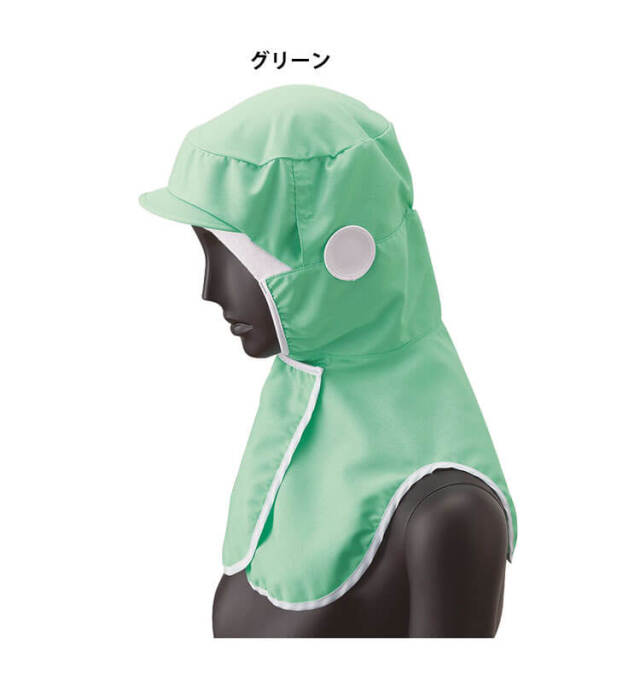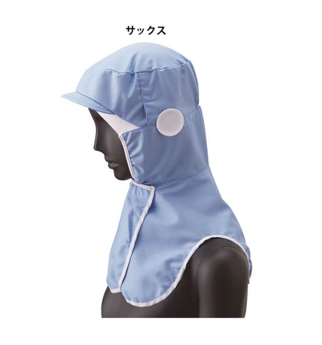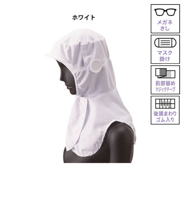 SERVOサーヴォの衛生白衣帽子です。異物混入対策が必要な食品工場全般に最適なフードタイプです。異物混入対策に特化した、食品工場全般に適したタイプです。首から胸にかけてケープが付いているので、体毛落下防止をより強化した形状が特長です。アクアクール素材は、肌に触れるだけで感じられるヒンヤリ感が特徴です。生地裏は、凹凸のある“点タッチドライ設計”と高い熱伝導率素材で、ヒンヤリとした冷感を実現します。優れた吸汗・速乾性も持ち合わせた高機能素材です。メガネさしは、スリットにツルを差し込むだけなので、着脱が容易に行えます。