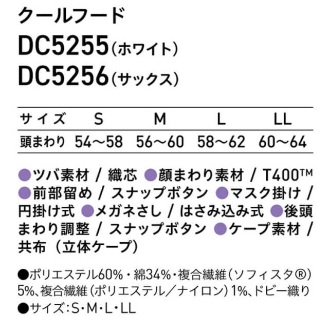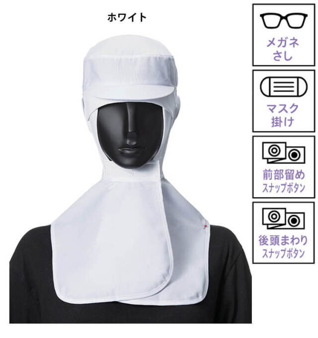 SERVOサーヴォの衛生白衣帽子です。異物混入対策が必要な食品工場全般に最適なフードタイプです。異物混入対策に特化した、食品工場全般に適したタイプです。首から胸にかけてケープが付いているので、体毛落下防止をより強化した形状が特長です。アクアクール素材は、肌に触れるだけで感じられるヒンヤリ感が特徴です。生地裏は、凹凸のある“点タッチドライ設計”と高い熱伝導率素材で、ヒンヤリとした冷感を実現します。優れた吸汗・速乾性も持ち合わせた高機能素材です。メガネのフレームをはさみ込むため、スリット式よりも隙間がなく、毛髪落下をより防げます。軽くて頭にしっかりフィットするSERVOの人気フードシリーズ「ずれな衣。」安心、安全のためにフードができることを改めて考えて開発されたのが、ずれな衣。フードです。軽量で頭にぴったりフィットする形状にすることで、着用時のズレを軽減。毛髪落下防止につながるとともに、作業時の帽子のズレによる作業効率の低下も防ぎます。頭にしっかりフィットする少し深めのハチマキ型です。頭部をぐるっと囲む少し深めのハチマキ型で、頭と帽子のフィット感が増し、ずれにくいです。