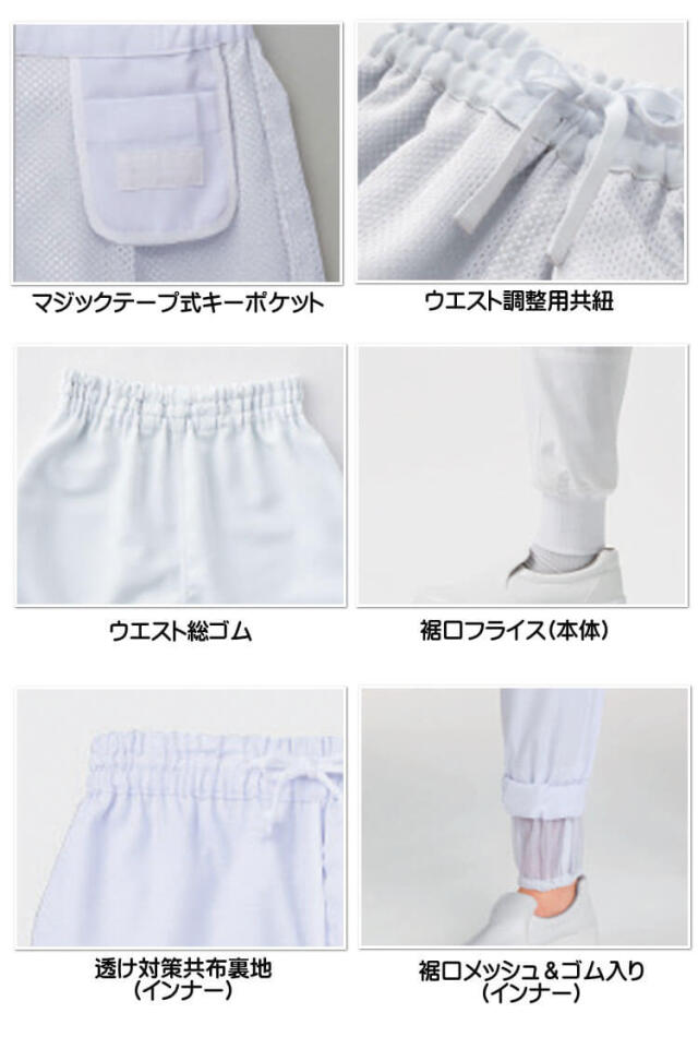 SERVOサーヴォの衛生白衣のホッピングパンツです。高温作業場向けのユニフォームです。アクアクール素材は、肌に触れるだけで感じられるヒンヤリ感が特徴です。生地裏は、凹凸のある“点タッチドライ設計”と高い熱伝導率素材で、ヒンヤリとした冷感を実現します。優れた吸汗・速乾性も持ち合わせた高機能素材です。