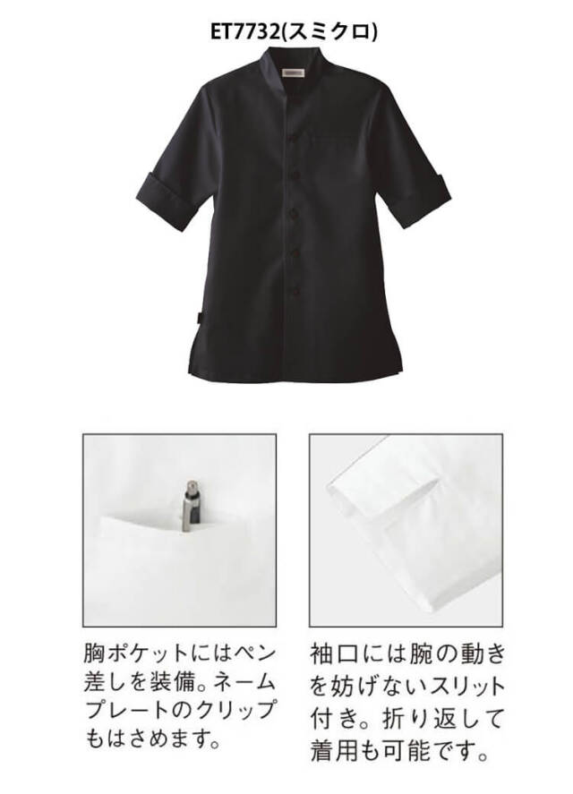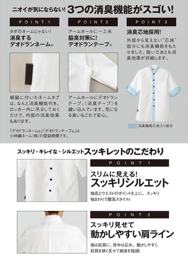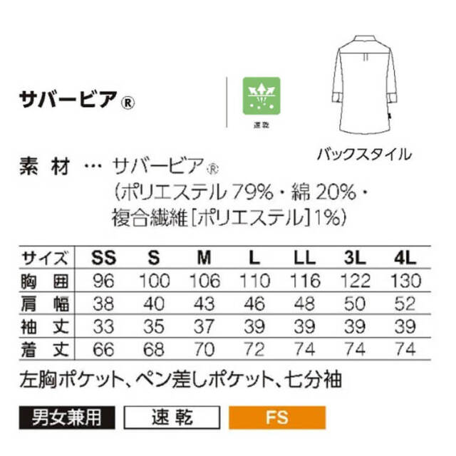 スマートかつスリムなスッキリシルエットなのに、動きやすく設計された人気のショップコートです。袖底とウエストのポイントを上に。スッキリ袖まわりで腰高・スリムに見えるシルエット。パターンは袖を前肩にして背中は広めにとり、動かしやすく、前肩を狭く見せて細身を強調。すだれのような立体構造で通気性に優れ、サラッとした着心地の「サバービア(R)」を採用。※「サバービア(R)」はシキボウ株式会社の登録商標です。●男女兼用のSS、Sサイズはレディス用、Mサイズ以上はメンズ用。