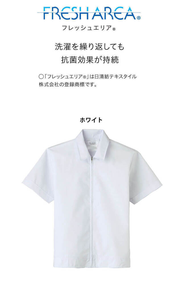 SERVOサーヴォの衛生白衣の半袖ジャンパーです。常温作業場向けのユニフォームです。フレッシュエリア素材は、微生物の繁殖を抑える抗菌効果があり、洗濯を繰り返しても落ちないので、いつでもクリーンに保てます。梱包、物流業務等に最適な衿元で選べるレギュラーカラータイプです。