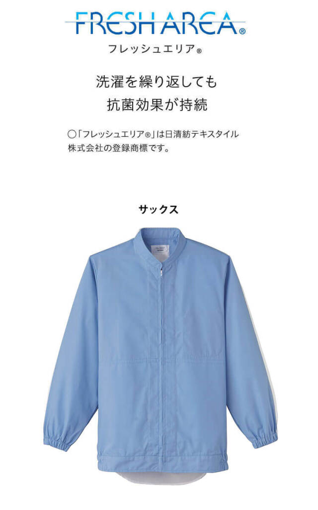 SERVOサーヴォの衛生白衣の長袖ジャンパーです。常温作業場向けのユニフォームです。フレッシュエリア素材は、微生物の繁殖を抑える抗菌効果があり、洗濯を繰り返しても落ちないので、いつでもクリーンに保てます。体毛落下防止機能を備えた異物混入対策仕様です。