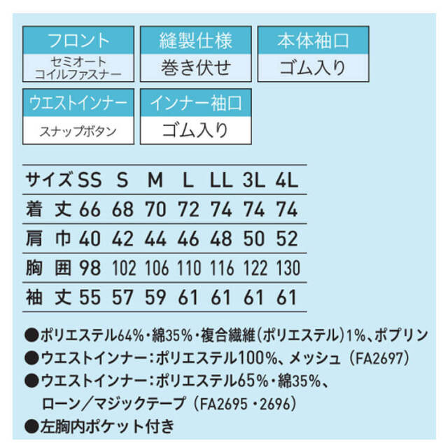 | 製品名: | 食品工場白衣 長袖ジャンパー FA2696 FA2697 男女兼用 サーヴォ SERVO フードファクトリー 常温作業向け 制服 ユニフォーム |