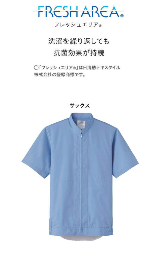 SERVOサーヴォの衛生白衣の半袖ジャンパーです。常温作業場向けのユニフォームです。フレッシュエリア素材は、微生物の繁殖を抑える抗菌効果があり、洗濯を繰り返しても落ちないので、いつでもクリーンに保てます。水場作業に最適なインナー付き半袖タイプです。
