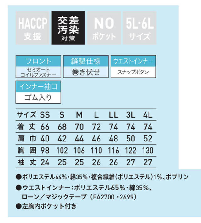 | 製品名: | 食品工場白衣 半袖ジャンパー FA2699 FA2700 男女兼用 サーヴォ SERVO フードファクトリー 常温作業向け 制服 ユニフォーム |