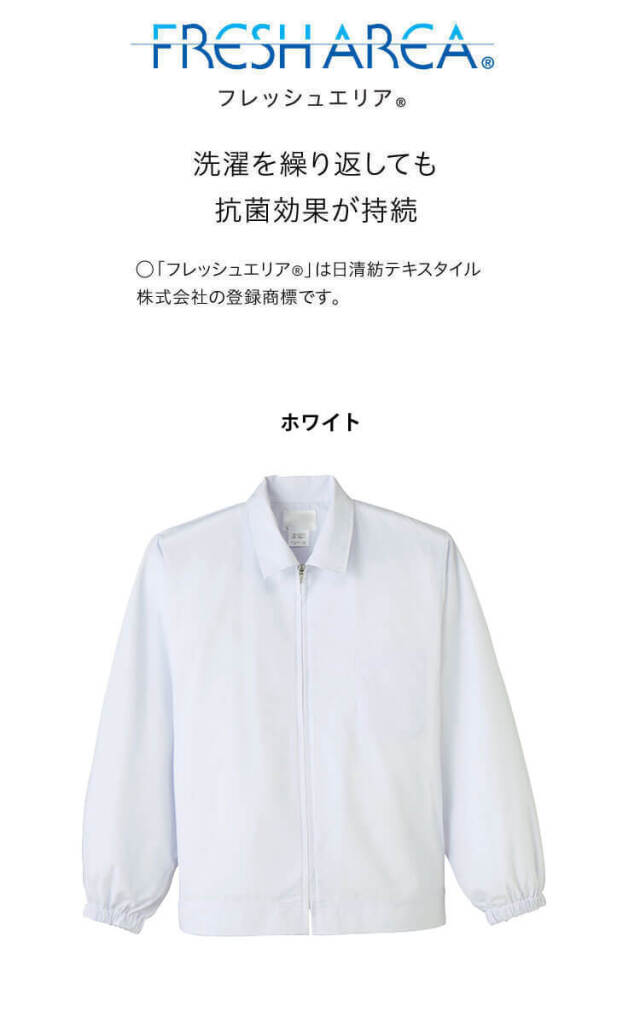 SERVOサーヴォの衛生白衣の長袖ジャンパーです。常温作業場向けのユニフォームです。フレッシュエリア素材は、微生物の繁殖を抑える抗菌効果があり、洗濯を繰り返しても落ちないので、いつでもクリーンに保てます。給食サービスなどにおすすめのインナー袖付きタイプです。
