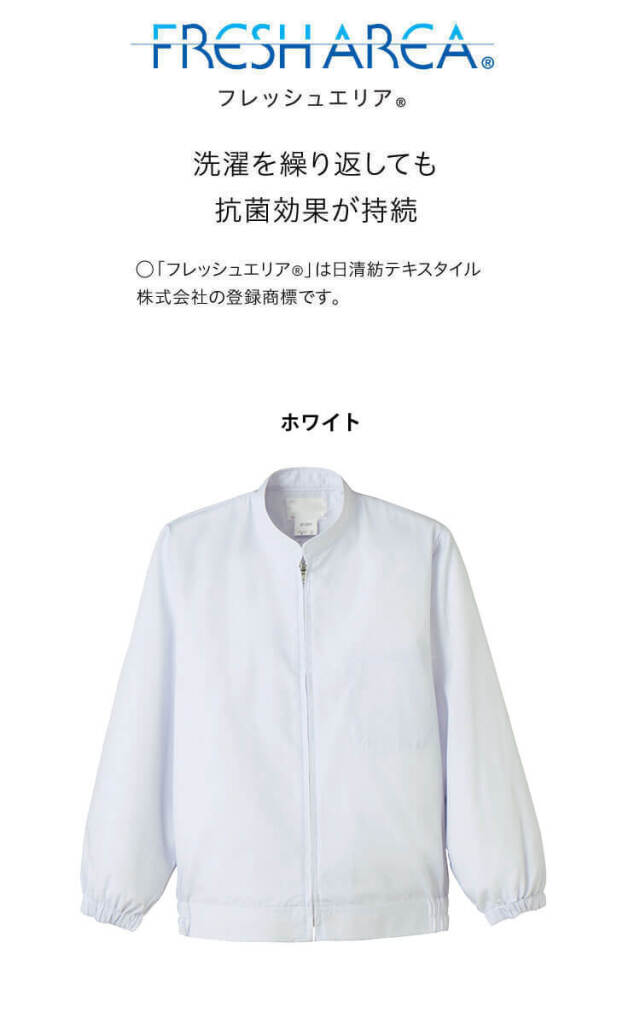 SERVOサーヴォの衛生白衣の長袖ジャンパーです。常温作業場向けのユニフォームです。フレッシュエリア素材は、微生物の繁殖を抑える抗菌効果があり、洗濯を繰り返しても落ちないので、いつでもクリーンに保てます。給食サービスなどにおすすめのインナー袖付きタイプです。