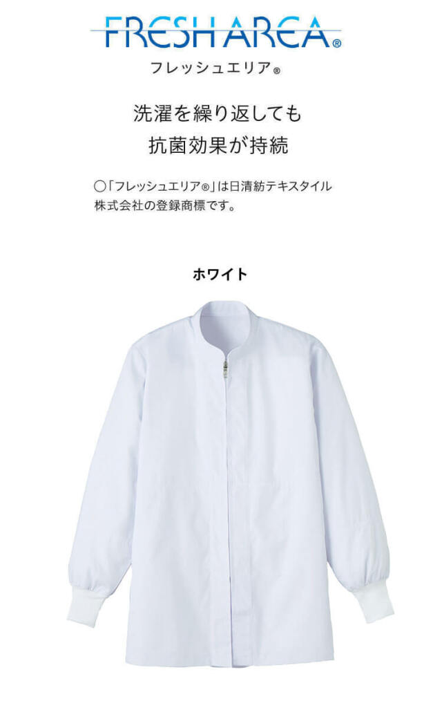 SERVOサーヴォの衛生白衣の長袖コートです。常温作業場向けのユニフォームです。フレッシュエリア素材は、微生物の繁殖を抑える抗菌効果があり、洗濯を繰り返しても落ちないので、いつでもクリーンに保てます。ノーポケットでほつれ防止や体毛落下防止を強化した、HACCP支援対応コートです。