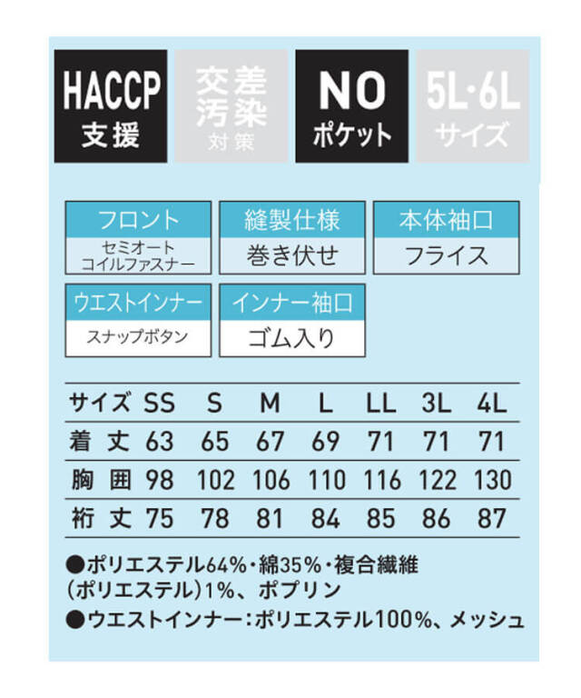 | 製品名: | 食品工場白衣 長袖ジャンパー FAP2719 男女兼用 サーヴォ SERVO フードファクトリー 常温作業向け 制服 ユニフォーム |