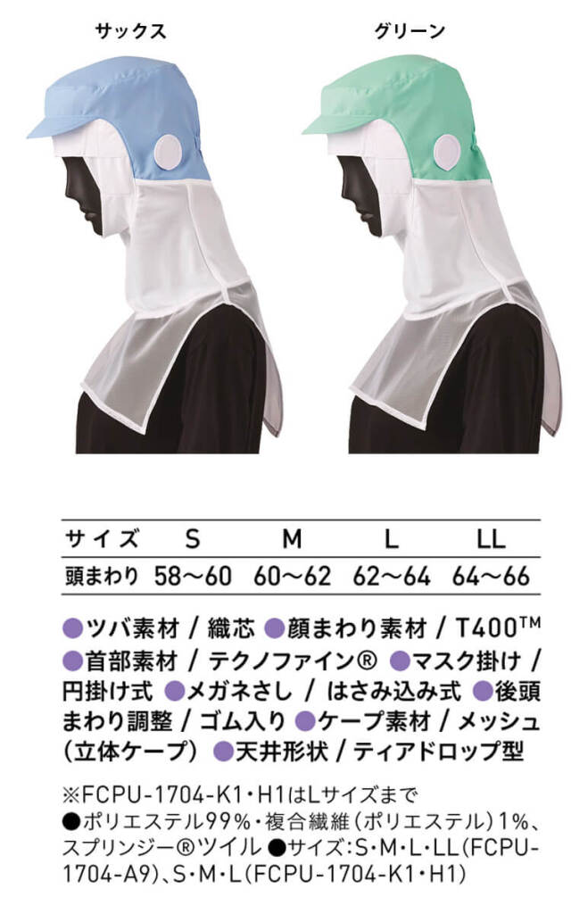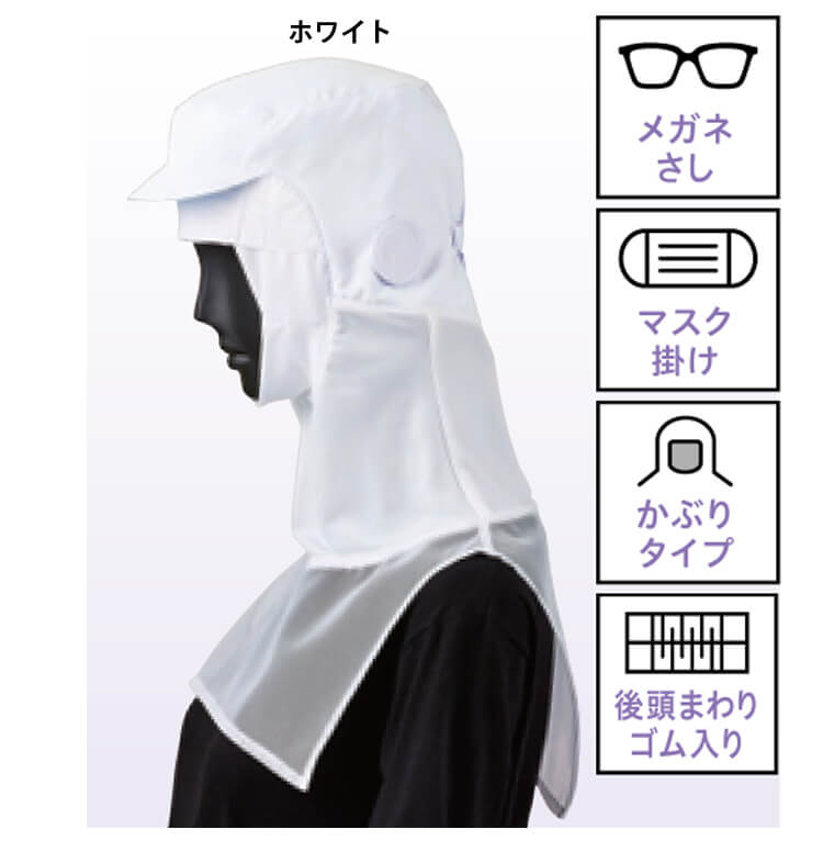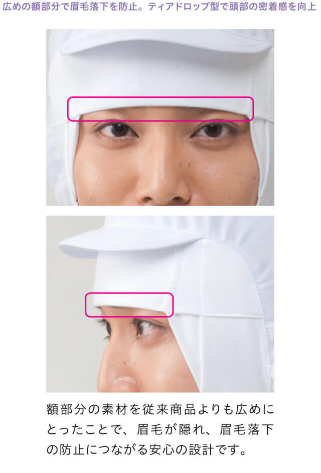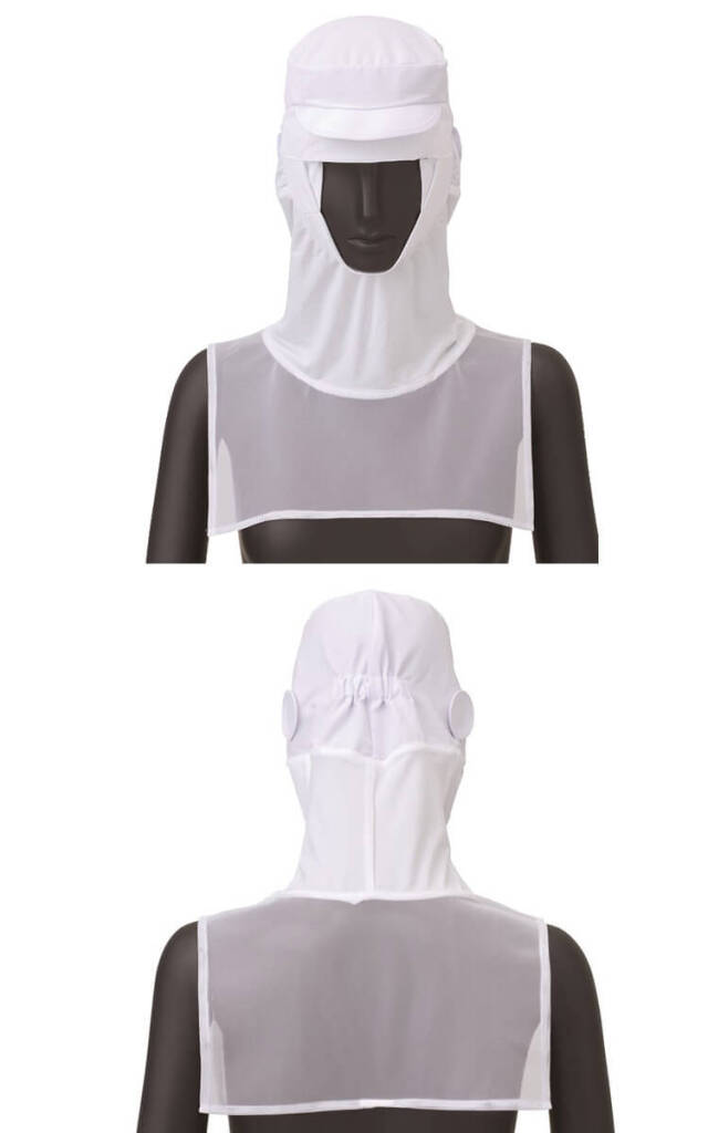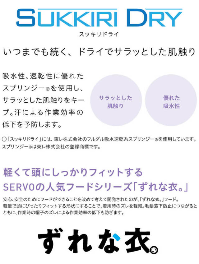 SERVOサーヴォの衛生白衣帽子です。異物混入対策が必要な食品工場全般に最適なフードタイプです。異物混入対策に特化した、食品工場全般に適したタイプです。首から胸にかけてケープが付いているので、体毛落下防止をより強化した形状が特長です。スッキリドライ素材は、いつまでも続く、ドライでサラッとした肌触りです。吸水性、速乾性に優れたスプリンジーを使用し、サラッとした肌触りをキープします。汗による作業効率の低下を予防します。メガネのフレームをはさみ込むため、スリット式よりも隙間がなく、毛髪落下をより防げます。軽くて頭にしっかりフィットするSERVOの人気フードシリーズ「ずれな衣。」安心、安全のためにフードができることを改めて考えて開発されたのが、ずれな衣。フードです。軽量で頭にぴったりフィットする形状にすることで、着用時のズレを軽減。毛髪落下防止につながるとともに、作業時の帽子のズレによる作業効率の低下も防ぎます。広めの額部分で眉毛落下を防止。ティアドロップ型で頭部の密着感を向上します。額部分の素材を従来商品よりも広めにとったことで、眉毛が隠れ、眉毛落下の防止につながる安心の設計です。