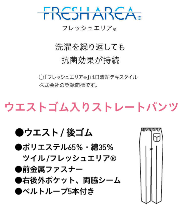 SERVOサーヴォの衛生白衣のウエスト後ゴム入りのストレートパンツです。男性用です。学校、社員食堂、福祉施設、病院などの給食サービスに対応したユニフォームです。フレッシュエリア素材は、微生物の繁殖を抑える抗菌効果があり、洗濯を繰り返しても落ちないので、いつでもクリーンに保てます。