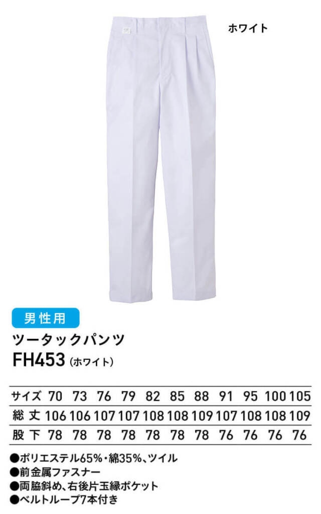 | 製品名: | 食品工場白衣 ツータックパンツ FH453 男性用 メンズ サーヴォ SERVO フードファクトリー 常温作業向け 制服 ユニフォーム |