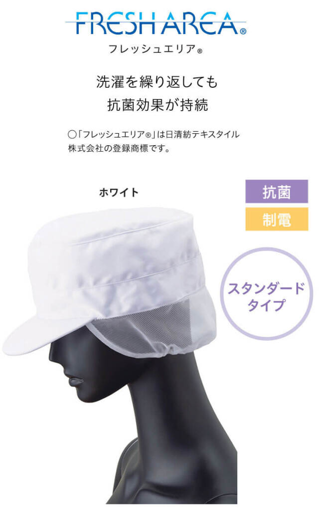 SERVOサーヴォの衛生白衣帽子です。着脱が容易なキャップタイプです。着脱が簡単で、検品・運搬・配送等の幅広い作業環境におすすめです。後頭まわりの調節機能や毛髪落下を防ぐメッシュケープなど、基本機能を備えています。衝突防止の安全性を考慮し、ツバを厚く長めに設定しています。フレッシュエリア素材は、洗濯を繰り返しても抗菌効果が持続します。