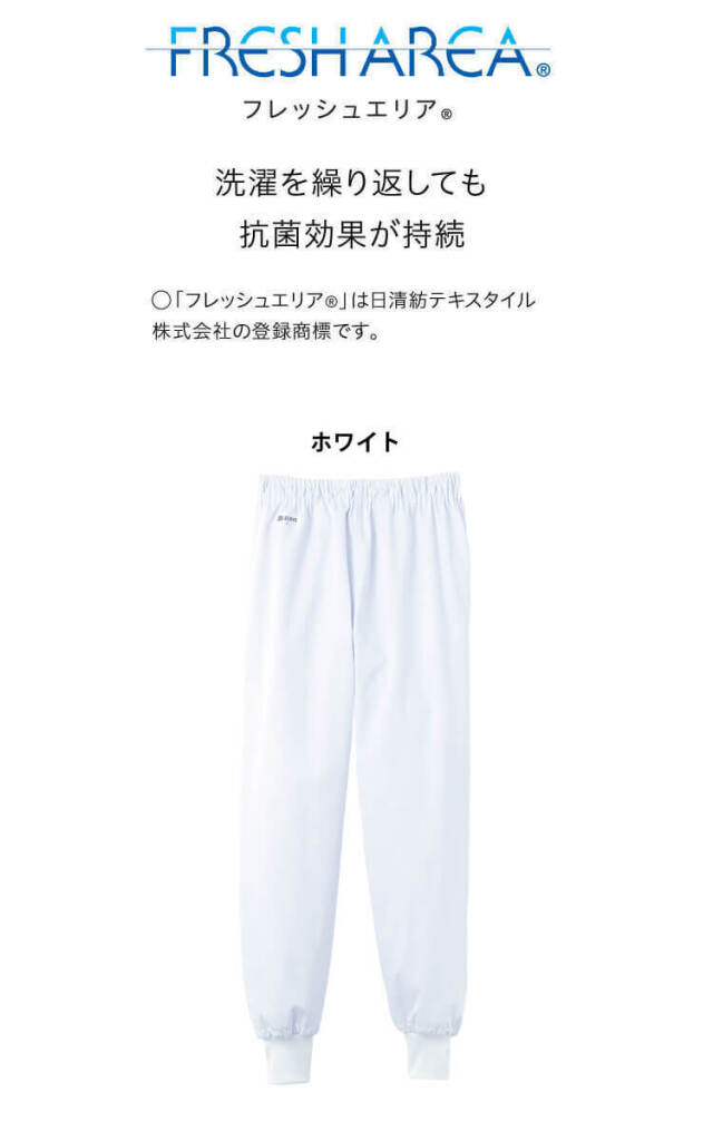 SERVOサーヴォの衛生白衣のホッピングパンツです。常温作業場向けのユニフォームです。フレッシュエリア素材は、微生物の繁殖を抑える抗菌効果があり、洗濯を繰り返しても落ちないので、いつでもクリーンに保てます。