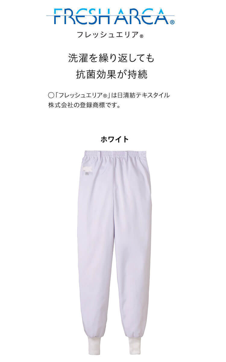 SERVOサーヴォの衛生白衣の女性用ホッピングパンツです。常温作業場向けのユニフォームです。フレッシュエリア素材は、微生物の繁殖を抑える抗菌効果があり、洗濯を繰り返しても落ちないので、いつでもクリーンに保てます。