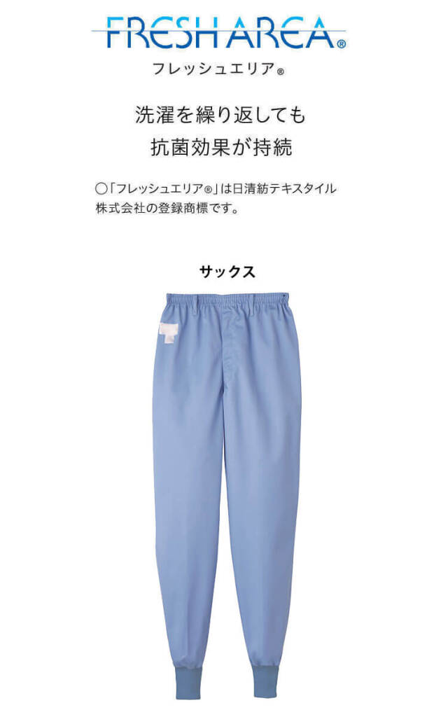 SERVOサーヴォの衛生白衣の男性用パンツです。常温作業場向けのユニフォームです。フレッシュエリア素材は、微生物の繁殖を抑える抗菌効果があり、洗濯を繰り返しても落ちないので、いつでもクリーンに保てます。