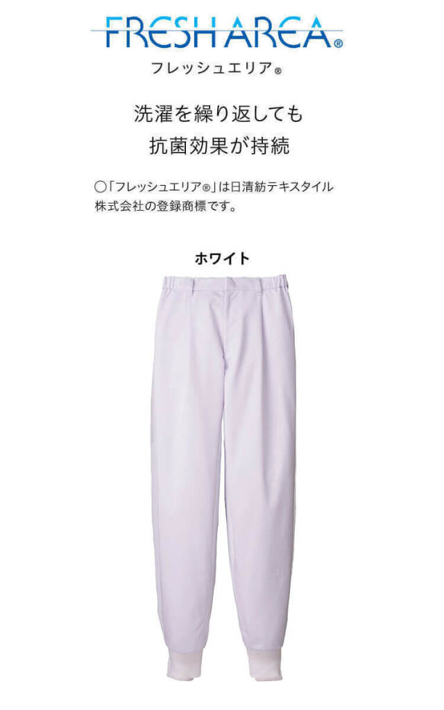 SERVOサーヴォの衛生白衣のホッピングパンツです。常温作業場向けのユニフォームです。フレッシュエリア素材は、微生物の繁殖を抑える抗菌効果があり、洗濯を繰り返しても落ちないので、いつでもクリーンに保てます。