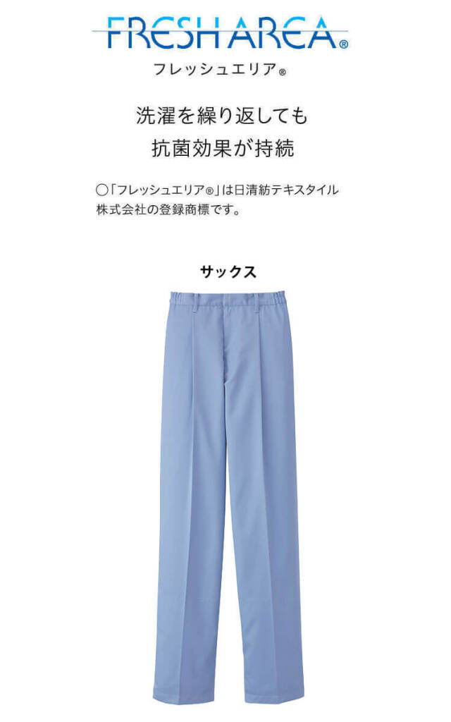 SERVOサーヴォの衛生白衣のメンズ用パンツです。常温作業場向けのユニフォームです。フレッシュエリア素材は、微生物の繁殖を抑える抗菌効果があり、洗濯を繰り返しても落ちないので、いつでもクリーンに保てます。