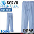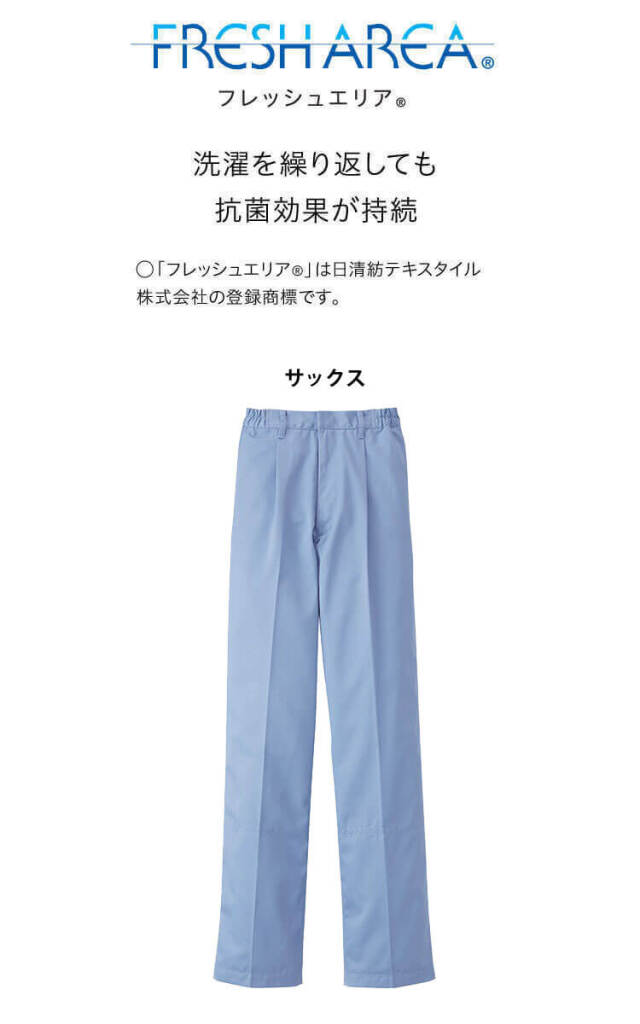 SERVOサーヴォの衛生白衣の男性用パンツです。常温作業場向けのユニフォームです。フレッシュエリア素材は、微生物の繁殖を抑える抗菌効果があり、洗濯を繰り返しても落ちないので、いつでもクリーンに保てます。